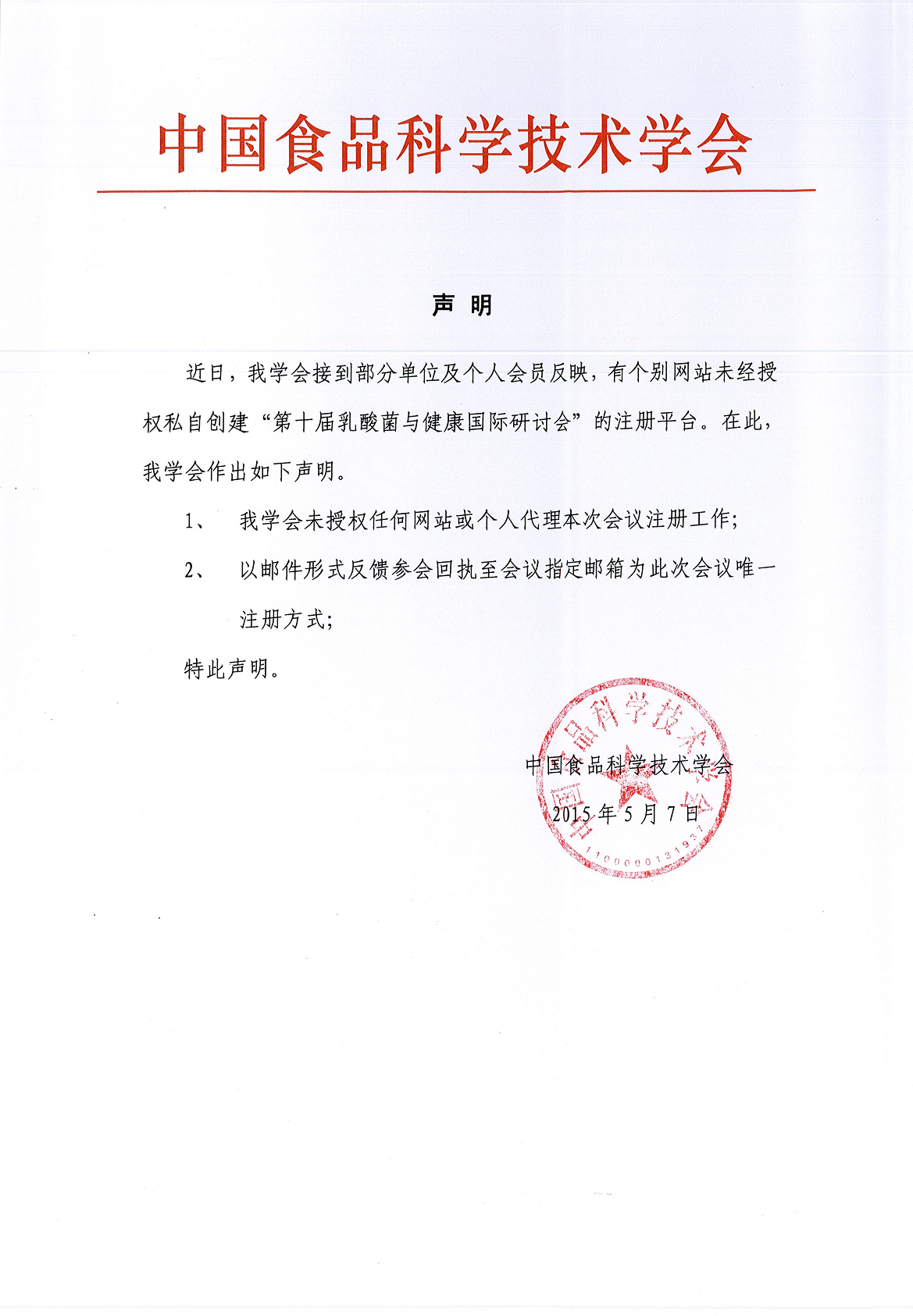 關于“第十屆乳酸菌與健康國際研討會”會議注冊的聲明